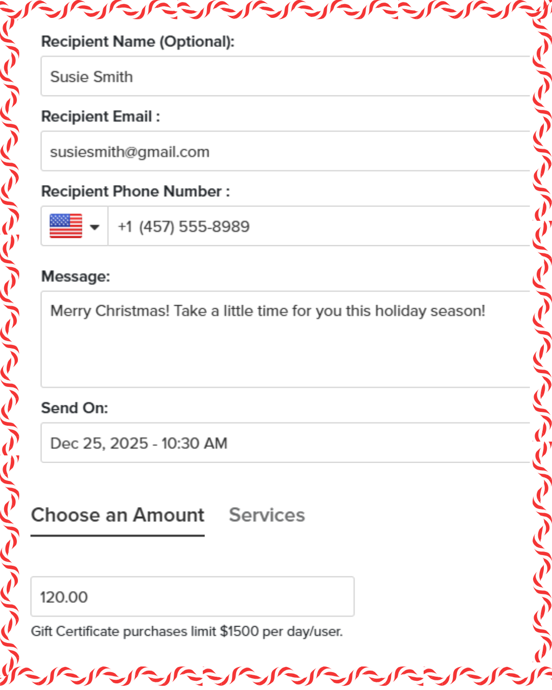To send your recipient their gift certificate: enter their name, email and phone number.
